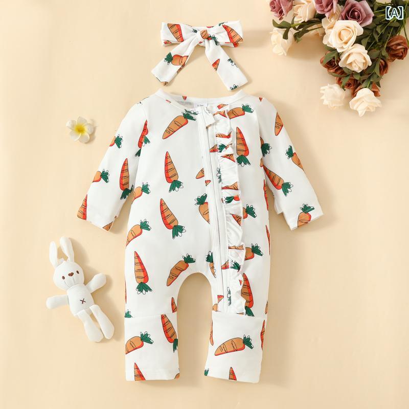 ロンパース 女の子 ベビー 新生児 長袖 足つき ニンジン ウサギ プリント ジッパー ファスナー イースター カジュアル カバーオール ニット ポリエステル 普段着 オレンジレッド