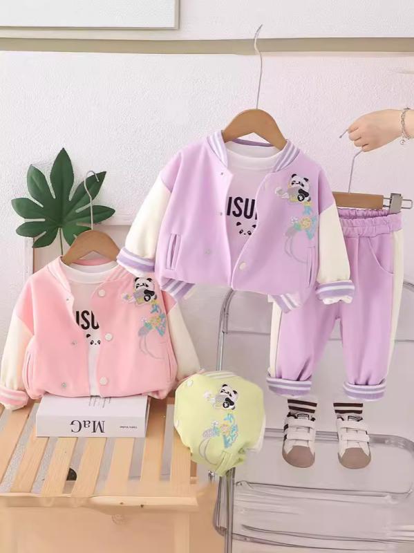 セットアップ 女の子 ベビー キッズ 子供服 春秋 柔らかな肌触り 綿混 キャラクター柄 切り替え 配色 ラウンドネック 長袖 ベースボールジャケット 3点セット スポーツ ロングパンツ カジュアル 普段着 お出かけ