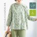 大胆な花柄が映える長袖シャツで、すっきりとしたネックラインと程よい袖丈、ヒップにかかる丈感が特徴のゆったりシルエットは体型カバーを叶えつつ広がりすぎない形状に仕上げ、前開き仕様で羽織りとしても着回せる一枚です。