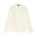 オフィスにも普段にも使えるフリルスタンドカラーブラウス。
