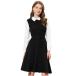 このショートドレスは、コントラストのあるターンダウンカラーとフロートな裾に落ちる長袖が特徴です。