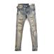 全体的にダメージ加工が施され、フロント部分にあるペイズリー柄のデニムパネルが特徴のスキニーパンツ。