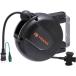 工事・照明用品 コードリール・延長コード 電源リール ●非常に小型・軽量で場所を取らない設計です。●着脱が容易な取付けベースを採用しています。●ラチェットロック式です。●自動復帰型サーモスイッチを内蔵しています。●必要に応じて首振り可能です。●吊り下げ・壁付け両用タイプです。●巻取り側先端はコンセントプラグです。●ロックフリー機能の別作可能です。●100V電力の供給用。●各種組み立てライン、メンテナンス工場などに。●機械や作業台下への組込みに。●電線仕様長さ(m):6●電線仕様太さ([[MM2]]):1.25●電線仕様芯数(C):3●定格電圧(V):AC125●定格電流(A):6●コンセント仕様形状:3P×2 2P×1アース付●コンセント仕様個数:3●電線種:SVCT●幅(mm):147●奥行(mm):228●高さ(mm):272●色:黒●コンセント仕様:12A/125V●一次側コード全長:0.8m●本体寸法(mm):272×228×147●ケーブル:ビニルキャブタイヤケーブル●本体カバー:樹脂●取付けベース一式●使用時はケーブルを全て引き出してください。