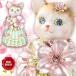 桜のブーケを手に、春色のワンピースを着ている仔猫です。