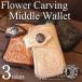 厚手でキメが細かなサドルレザー(馬鞍にも使われる丈夫な牛革)を使いフラワーモチーフのカービングを施したレザーウォレット。植物タンニンでなめした牛革は使い込むほどに風合いを増し長くお使いいただける素材で、またアウトラインはダブルかがり縫いで仕上げた大変手の込んだ作り。ミドルサイズですのでズボンの後ろポケットに収納し易く女性の方にも扱いやすいお財布となっております。