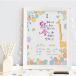 男の子・女の子どちらの赤ちゃんにも合う、キリンや小鳥、お花をモチーフにしたかわいいデザインです。お父さんとお母さんが一生懸命考えた命名のタイミングで、ネームインポエムを贈って飾っていただきたいという思いから生まれました。