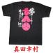 真田幸村の家紋入り!黒Tは白文字、白Tは黒文字、真っ赤な結び雁金(むすびかりがね)、州浜(すはま)、割州浜(わりすはま)が粋です。胸には、ご存知六文銭の家紋がプリントされています。