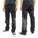 Switch Planning(スイッチプランニング)の和柄ブランド・花旅楽団 SCRIPT(スクリプト)のデニムパンツです。シルエットは、ジップフライの、レギュラーストレートです。素材はコットン100%のワンウォッシュデニム生地です。リジット(ノンウォッシュ)のようなデニムですが、ワンウォッシュ済みですので縮みが少なく(縮率は通常の洗濯で3%以内)、サイズ選びも容易なのが特徴のデニムです。両足にはスカルの刺繍がほどこされています。バックパッチは「花旅楽団」ロゴ刻印入りのレザーパッチです。作品名は「SP-601 花旅楽団 抱付ドクロ柄刺繍デニムパンツ」です