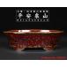 型は東福寺が用いた人気のデザインをリサイズ。柔らかな型で深さがあるので迫力のある樹も受け止めます。釉薬は陶あん当代・土渕善亜貴氏オリジナル「星結晶」。結晶釉は釉薬が溶けて冷却する過程で結晶が出る特性を持ったおり、この結晶化する特性を活かして作り上げたのが、オリジナルの釉薬「星結晶」。ベースは京焼特有の美しい発色を見せる辰砂釉。通常の辰砂釉は斑紋の結晶を見せますが、泉山鉢は大小様々な星型の結晶が出ています。結晶の出方は1枚1枚異なり、2つとして同じ文様が出ないのが特徴で、多種多様な結晶の形が楽しめます。落款は「泉山」と窯元・陶あんの落款「あん」