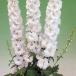 F1種子系のデルフィニウム。草丈1m前後で秋〜年内および2〜3月開花の1回切りに向く。茎硬く丸みのある美しい純白の大輪咲き。花径:6.0cm/草丈:120cm/葉の大きさ:中小(目安10ml種子粒数:900〜1,300粒)