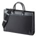 学生の就職活動、インターン、入学式、毎日の通勤用として最適な、シンプルデザインのビジネスバッグ。ショルダーベルト付きで肩掛け使用もできる。A4書類や14型ワイドノートPCを収納できるサイズ。撥水加工。ブラック。