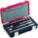 差込角1/4”と3/8”のソケット、ラチェットレンチ等をまとめたセットです。強靭で耐久性に優れたクロームバナジウム鋼を使用。保管や持ち運びに便利なメタルケース入り。