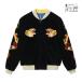 中綿を排した珍しい仕様の別珍スカジャンです。ブラックのボディには、深みのあるゴールドの虎と、袖全体に広がるダイナミックな龍を刺繍。赤糸の「JAPAN」文字などの鮮やかな色使いが際立ちます。中綿とキルティングを省くことで、もたつかずスマートなシルエットを実現。裏面はサテン地にジャパンマップと鷲を描いたリバーシブル仕様で、季節を問わず両面の豪華な刺繍を楽しめる一着です。