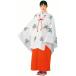 千早の柄は、深緑の鶴と松、清楚な白無地のものと比べてさらに格式が高い印象です。背中心と両外袖の3箇所には、菊綴「きくとじ」という緋色の紐を8の字に結んだ形の補強を兼ねた飾り紐が付いています。巫女用白衣/巫女用袴は別売になります。