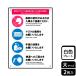 会場・施設の入口で感染症対策をお願いするプレート看板。[穴あけ加工]直径3mm穴×四隅(端から10mm)。[付属品]両面テープ(1プレートにつき6枚)。※ご注意※60℃以上となる環境下では使用しないでください。特に直射日光や風雨などにさらされる場所では、長期間の使用により印刷部が退色したりプレートが変色する可能性がありますので、定期的な取替をおすすめします。付属の両面テープは屋外でのご使用を避け、屋内でご使用ください。被着体によっては接着しにくい場合があります。また、はがす際に被着体を傷めるおそれがあります。