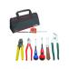 圧着端子:E形リングスリーブ小(1.6mm×2)・小・中・大、切断能力:2.0×3芯)、ペンチ(175mm 切断能力:VA線(VVF)2.0×3芯、鉄線3.0mm 銅線3.5mm)、ウォーターポンププライヤー(250mm :最大口開き45mm)、プラスドライバー(+2×100)、マイナスドライバー(ー5.5×100)、電工ナイフ(折りたたみ式)、コンベックス(13mm×2m)、ツールロール