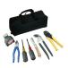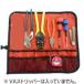 圧着端子:E形リングスリーブ小(1.6mm×2)・小・中・大、切断能力:2.0×3芯)、ペンチ(175mm 切断能力:VA線(VVF)2.0×3芯、鉄線3.0mm 銅線3.5mm)、ウォーターポンププライヤー(250mm :最大口開き45mm)、プラスドライバー(+2×100)、マイナスドライバー(ー5.5×100)、電工ナイフ(折りたたみ式)、コンベックス(13mm×2m)、ツールロール