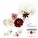 2.赤系:深い赤とゴールドの剣つまみのお花1点。白金の水引にパールビーズのお花大1点、小1点。くすみピンクのマム1点。深い赤の花びらにラメのペップのカメリア1点。淡いベージュ系のカメリアと小花1点。白金の水引の輪飾り1点。