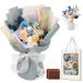 プリザーブドフラワーの花束:花屋が丁寧に作り上げたこのブーケは、誰もが大好きな鮮やかな青とオレンジ色のバラをセンターピースとして、繊細なクリスタルグラス、ラブグラス、愛らしいウサギの耳、さまざまな色合いのアジサイの葉をアクセントに添えています。