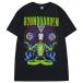 サイケデリックなカラーリングのキリスト教の悪魔バフォメット風のアートワークのTシャツ。
