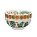 茶碗 色絵 松竹梅は、茶碗の口ぶちには黄色い帯が巻かれ、緑と赤で福と壽の文字が描かれています。