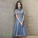 結婚式ドレス 二次会ドレス ブルー 襟付き 可愛い ミモレ丈ドレス スパンコール パーティードレス パフスリーブ オシャレ ミディアム丈 イブニングドレス