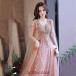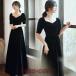 イブニングドレス 黒 ベロア ベルベット ロングドレス 結婚式ドレス 二次会ドレス 発表会ドレス パフスリーブ Vネック パーティードレス 半袖 Aライン ロング丈