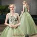 イブニングドレス グリーン 刺繍花柄 オシャレ 演奏会ドレス ロングドレス 緑 花柄 ノースリーブ Vネック パーティードレス 発表会ドレス ロング Aライン