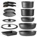 ・【セット内容・材質】鍋18cm/0.41kg、鍋20cm/0.55kg、フライパン20cm/0.38kg、フライパン26cm/0.59kg、炒め鍋26cm/0.58kg、卵焼きフライパン/0.39kg、26cmガラス蓋、16/18/20/cm兼用蓋、専用取っ手×2本、シール蓋18cm、シール蓋20cm、梱包重