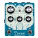ステレオフィルターリバーブタワーズの音の元となるものは、入力された信号を無限にリピートを繰り返すショートエコーの波です。その波の塊が生命を吹き込まれた様な動きを作る壮大なリバーブとなり出力されます。Lengthでその長さ、形、響きの感触を操作します。そのリバーブはレゾナントローパスフィルターの複数のポイントを通過し、神秘的で壮大な、通常のリバーブ機材では生まれる事の無い空間を演出します。“エフェクト”というよりは、音を“体現”できるペダルです。フィルター帯域の動きの選択がこのペダルの音を体現する重要な鍵になります。この独特な3モードの選択肢は以下の通りです。Manualモードではフィルターの帯域の設定はユーザーの好きなポイントを選択でき、Frequencyノブの設定で右と左の出力が反復する動きを作れます。Envelopeモードは手元のピッキングや、使用楽器の入力信号の強弱を使ってフィルターの動きを制御します。3つの異なる動作モードManual Mode:フィルターの帯域はFrequencyで設定します。左右の出力される信号どちらにも効
