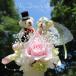 ご用途がウエディングなら、思いっきりウエディングぽさを出した、アレンジです。新郎・新婦のウエディングベアに青いバラを添えて、お祝いしましょ♪