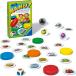 サイコロの目と同じ色のコマの下にあるカードの絵柄をあてるゲーム。言い当てたらそのカードをもらえます。一番多くカードを集めた人(=絵柄を言い当てた回数が多い人)が勝ちのゲームです。