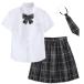 【制服コスプレ4点セット】女子高生 制服の魅力を最大限に引き出すセット内容!角襟半袖白シャツ、チェック柄のプリーツスカート、リボン、ネクタイの4点セット。43cmのスカート丈でスタイルアッ