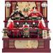 木目を透かした趣のある紅色の飾り台に、優し気に微笑む上品なお顔立ちのお人形が良く調和する、晴れの日のお祝いに相応しい華麗で雅やかなデザインに魅せられるおひなさまです。