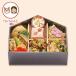 彩り豊かな具材を絵馬に見立てた五角形のお重に詰めました。