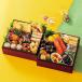 田作り、丹波黒黒豆、里芋含め煮、たたきごぼう、にしん一口巻昆布、栗きんとん、味付しいたけ、穂先竹の子、なます、焼ほたて、だし巻、手綱こんにゃく、高野豆腐含め煮、祝海老、紅白豆マリネ、白福豆、照焼つくね、ぜいたく煮