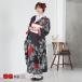 シックな黒地に配された真紅の薔薇と、全体に散らされた可憐なかすみ草が印象的なお着物です。ぎりぎりまでおさえた色数、モダンな図柄が、すっきりとクールな印象です。