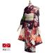 シックな濃茶紫地にオレンジのぼかしを加え、華やかなレッド系のブーケをあしらった、明るく豪華な印象のお着物です。桜は日本を象徴する花ですので、春に限らず着用していただけます。