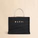 織地を使用したEast-Westスモールトートバッグ。コットンリボン製の2ハンドルデザイン、ショート丈でハンドキャリー、ロング丈でショルダーキャリーが可能。ファスナーポケット付きのファブリックライニング。パラジウム製のメタルパーツ。前面にマルニロゴ刺しゅう。